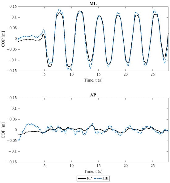 Trial 2 COP position comparison. Force plate (FP) versus handheld (HH) smartphone, where ML and AP represent the medio–lateral and antero–posterior axes, respectively.