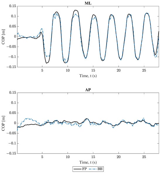 Trial 2 COP position comparison. Force plate (FP) versus back harness (BH) smartphone, where ML and AP represent the medio–lateral and antero–posterior axes, respectively.