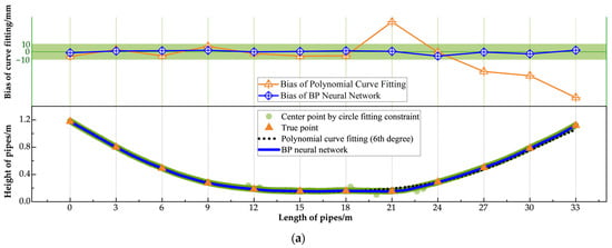 - Under the proposed optimal fitting method (BP neural network combined with the circle fitting constraint method), the average detection errors for the three pipes were 2.2 mm, 1.4 mm, and 1.6 mm, respectively, with maximum detection errors of −5.8 mm, −4.2 mm, and −5.7 mm, all of which meet the requirements of construction standards.