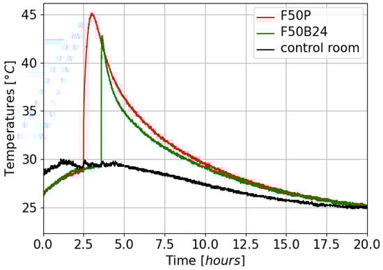 Temperature of the control room, as well as exothermic curves of the two resin during their polymerization.
