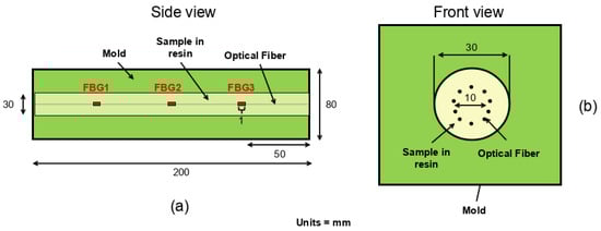 Conceptual schemes showing the embedded FBGs and the geometry of the resin samples. (a) Schematic longitudinal section of the mold showing the position of the FBGs along each inscribed fiber. FBG1, FBG2, and FBG3 denote the three FBGs of one fiber. (b) Front view of the mold with the resin sample inside.