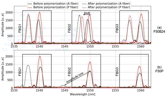 Reflectivity spectra of the three FBGs inscribed on the A (in black) and P (in red) fibers before (solid lines) and after (dotted lines) the polymerization of the F50B24 (a) and F50P (b) resins. The black boxes delimit the location of the FBG1, FBG2, and FBG3 spectra. The arrows labeled “shift” and “amplitude loss” highlight the main effects attributed to the shrinkage of the resin during the polymerization.