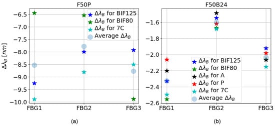 Shift of the central wavelength induced by the material shrinkage of the three FBGs of each inscribed fiber type embedded in the two resin samples. (a,b) represent the shift of the central wavelength for the optical fibers embedded in the resin F50P and F50B24, respectively.