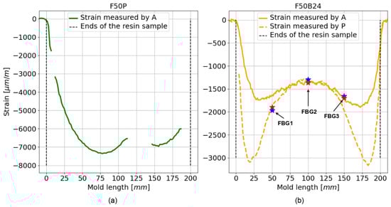 1D static strain profile along the axes of the resin samples. (a,b) represent the 1D static strain profile for the optical fibers embedded in the resin F50P and F50B24, respectively. The blue and red stars correspond to the local strain values measured using Equation (1) and the average wavelength shift of the FBGs inscribed in the P and A fiber, respectively.