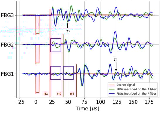 Pre-stack data recorded by the three FBGs inscribed in the A fiber (green curves) and P fibers (blue curves) embedded in the F50B24 resin sample. The red lines represent the predicted travel times, tt1, tt2, and tt3, for the three FBGs. The purple rectangles represent the crosstalk observed between the three FBGs.
