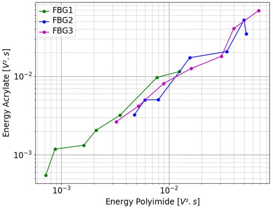 In addition to the previous results, several pairs of signals were recorded using the same setup for all three FBGs but with varying source intensities. The goal was to compare the energy of the dynamic strain signal transferred to the fiber core, where FBGs are inscribed, through the acrylate and polyimide coatings. The results are presented in Figure 9, which uses logarithmic scales. The plot shows the energy of the stacked signals recorded by the FBG for the acrylate-coated fiber on the y-axis and the polyimide-coated fiber on the x-axis. The energy of a signal is calculated as follows: