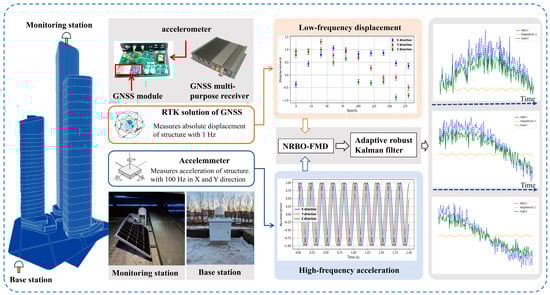 To meet the demand for real-time noise parameter estimation in the multi-rate fusion of GNSS and accelerometer data, this study introduces a fusion algorithm based on Newton–Raphson Optimization (NRBO), Feature Modal Decomposition (FMD), and Adaptive Robust Kalman Filtering (ARKF) [36]. The proposed NRBO-FMD-ARKF algorithm enables dynamic estimation of displacement noise parameters by integrating GNSS and accelerometer measurements, thereby significantly improving the accuracy and robustness of displacement estimation [37].To evaluate the performance of the algorithm, numerical simulations were conducted under various conditions, including different natural frequencies, randomly initialized noise parameters, and time-varying noise scenarios [38]. These simulations assessed the algorithm’s accuracy and stability in system displacement estimation. Subsequently, the 333 m-tall Changchun HaiRong Plaza was selected as a case study. Real-world monitoring data were employed to investigate the building’s dynamic response under actual operating conditions. Frequency-domain analyses were performed on the fused displacement results, raw accelerometer data, and GNSS RTK solutions. The results demonstrated that the proposed method offers clear advantages in identifying modal frequencies and provides a more comprehensive representation of the building’s dynamic characteristics. The main research process includes numerical validation, analysis of real-world operational data, and comparative frequency-domain analysis. The technical workflow of the proposed method is shown in Figure 1. This study presents an effective solution for the precise monitoring of dynamic displacement in super-tall buildings and offers new insights into the practical application of multi-sensor data fusion techniques.