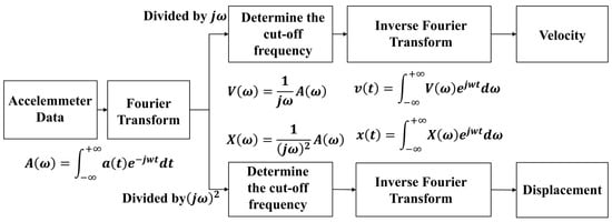 When integrating acceleration in the time domain, a zero-drift phenomenon occurs, leading to the gradual accumulation of errors and causing the calculated displacement to deviate from the true value [47]. By performing integration in the frequency domain, displacement data can be obtained more quickly and stably. Unlike time-domain integration, frequency-domain integration first requires a Fourier transform. Using the Fourier transform, the accelerometer data are processed in the frequency domain, followed by an inverse Fourier transform to obtain velocity and displacement information in the time domain. The fundamental principles are illustrated in the diagram below.