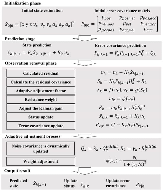 Adaptive Robust Kalman Filtering is an improved Kalman filtering method designed to address scenarios where observation noise exhibits a strongly non-Gaussian distribution (e.g., containing outliers) or where the statistical characteristics of the noise are unknown [48]. The core concept involves incorporating robust weighting and adaptive adjustment strategies within the traditional Kalman filtering framework. In this study, dynamic adjustments to both measurement noise and process noise are implemented to further enhance robustness.