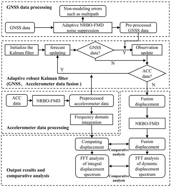 The integrated dynamic displacement reconstruction technique leverages the complementary advantages of Global Navigation Satellite System (GNSS) and accelerometer (ACC) sensors [49]. As shown in Figure 4, First, the NRBO-FMD algorithm is applied to GNSS data to mitigate unmodeled errors, such as multipath effects, yielding preprocessed GNSS displacement. Simultaneously, ACC data undergo noise suppression via NRBO-FMD, followed by frequency-domain integration to obtain displacement estimates. Subsequently, the preprocessed GNSS and ACC displacements are fused using an Adaptive Robust Kalman Filter (ARKF), which incorporates both prediction and observation update mechanisms to reconstruct high-accuracy dynamic displacement. The reconstructed displacement is then compared with the ACC-derived displacement obtained through frequency-domain integration. Finally, Fast Fourier Transform (FFT) is applied to analyze the dynamic displacement spectrum from the fused data and the integrated displacement spectrum from ACC data. This approach combines multi-sensor data fusion with spectral comparison analysis, offering a robust and reliable framework for dynamic deformation monitoring.