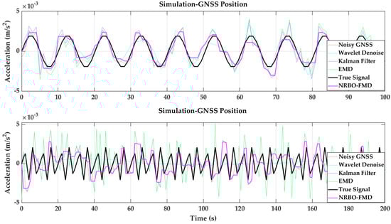 - The NRBO-FMD algorithm demonstrated excellent performance in suppressing noise from both GNSS and accelerometer data. For GNSS data, the RMSE of the 100 s dataset decreased to 0.0007, and the SNR improved by 3.0186 dB. For the 200 s dataset, the RMSE reduced to 0.0010, with a 5.9980 dB improvement in SNR. For accelerometer data, the RMSE of the 100 s dataset dropped to 0.0030, and for the 200 s dataset, it decreased to 0.0062, with a 4.1488 dB increase in SNR. These results indicate that the NRBO-FMD algorithm effectively processes various types of noise while retaining critical information.