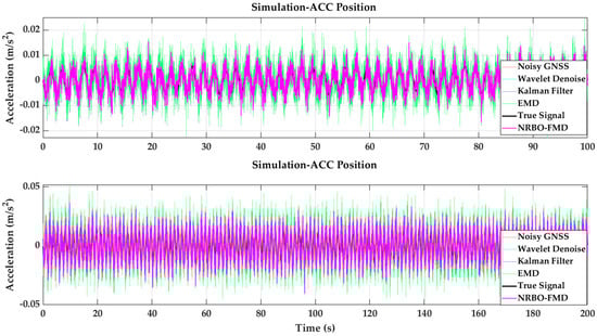 Accelerometers are highly susceptible to high-frequency noise during real-world measurements. In the simulation dataset, this noise exhibits pronounced high-frequency characteristics, typically originating from sensor vibrations and environmental disturbances, resulting in strong random fluctuations. To accurately replicate the high-frequency noise behavior of accelerometer (ACC) sensors, a synthetic dataset was constructed by superimposing multiple high-frequency sinusoidal signals and introducing random noise. This approach provides a realistic representation of measurement errors in complex environments, as illustrated in Figure 7 and Figure 8. Experimental results demonstrate that the NRBO-FMD algorithm offers significant advantages in suppressing high-frequency noise in ACC data. For the 100 s dataset, the RMSE of the denoised signal using NRBO-FMD was 0.0030, which is lower than that achieved by Kalman filtering (0.0050) and the Empirical Mode Decomposition (EMD) method (0.0050), underscoring its superior noise reduction capability. Similarly, for the 200 s dataset, NRBO-FMD maintained effective denoising performance, achieving an RMSE of 0.0062 and an SNR improvement of 4.1488 dB, significantly outperforming Kalman filtering (0.0849 dB) and the EMD method (–0.0035 dB). Overall, the NRBO-FMD algorithm demonstrates strong capabilities in attenuating high-frequency noise in ACC data, particularly in mitigating random high-frequency interference. These results confirm the algorithm’s enhanced stability and robustness in noise suppression, validating its suitability for accelerometer noise reduction applications.
