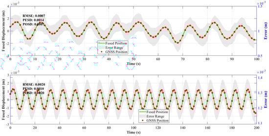 As shown in Figure 9, the displacement variations obtained through GNSS and ACC data fusion are presented for both the 100 s and 200 s datasets. In Figure 9, red dots represent GNSS observations, the green curve denotes the fused displacement data, and the gray-shaded area indicates the error range. The NRBO-FMD-ARKF algorithm effectively integrates the low-frequency characteristics of GNSS data with the high-frequency information from ACC sensors, achieving a complementary fusion. This fusion process successfully mitigates GNSS multipath errors while significantly reducing high-frequency noise in ACC measurements, resulting in smoother and more stable fused displacement data. From an error evaluation perspective, the 100 s dataset achieved an RMSE of 0.0007, with both PESD and POSD at 0.0010. For the 200 s dataset, the RMSE was 0.0019, with PESD and POSD also at 0.0019. These results indicate that the fused data maintain high accuracy over extended observation periods. Specifically, for the 100 s dataset, the fused data closely fit the GNSS observation points while effectively suppressing irregular error fluctuations. In the 200 s dataset, where the high-frequency characteristics of the ACC data are more pronounced, the NRBO-FMD-ARKF algorithm successfully suppresses high-frequency noise, maintaining a low error range and ensuring data stability and reliability. Overall, the NRBO-FMD-ARKF algorithm fully leverages the complementary strengths of GNSS and ACC data, resulting in fused measurements that not only minimize error influence but also significantly enhance measurement accuracy and robustness against interference. These findings validate the effectiveness of the proposed method in high-precision displacement monitoring and multi-sensor data fusion, offering strong support for real-world applications.