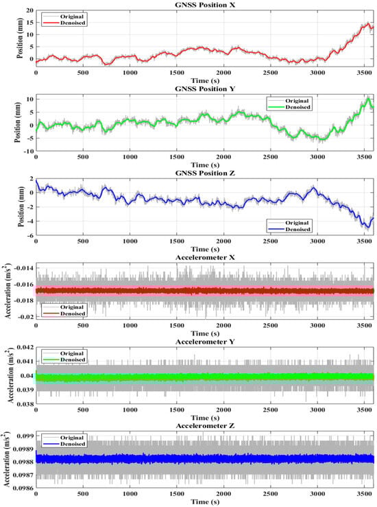 In this study, deformation monitoring data collected on 28 October 2022, from the Hairong Plaza Building in Changchun, were analyzed. The building is approximately 200 m tall. An integrated device combining a satellite receiver and an accelerometer was employed for data acquisition (see Table 2 for specific parameters). The installation site of the monitoring equipment is shown in Figure 1. The reference station was installed on the rooftop of a nearby stable building, specifically on the second floor in an open area, while the monitoring station was deployed on-site to conduct measurements. The GNSS receiver operated at a sampling frequency of 1 Hz, while the accelerometer sampled at 100 Hz. Both instruments recorded structural deformation data, and the GNSS and accelerometer time series used in this analysis are presented in Figure 10. This study focuses on three-dimensional deformation in coordinate directions, using one hour of monitoring data from 28 October 2022 for analysis. The NRBO-FMD algorithm was applied to the raw GNSS data to remove multipath effects, unmodeled errors, and certain high-frequency noise components, thus completing the preprocessing of the GNSS data. Similarly, the raw accelerometer data were preprocessed to eliminate low-frequency trends and minor noise artifacts.