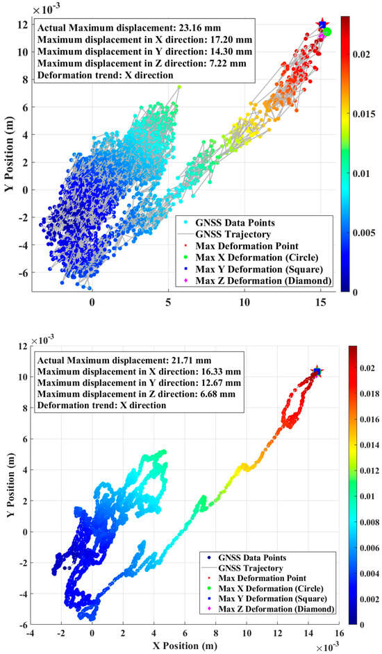 In the analysis of deformation data for super-tall buildings, a standardized coordinate system was established to unify the GNSS and accelerometer data within a consistent reference frame. The building’s structural coordinate system was adopted for this purpose. In this system, the X-axis aligns with the building’s longitudinal direction, the Y-axis with its transverse direction, and the Z-axis points vertically downward, following the direction of gravity. Initially, the GNSS observation data, originally recorded in the WGS84 geodetic coordinate system, were transformed and corrected for orientation to align with the structural coordinate system of the building. During installation, the accelerometer axes were carefully aligned with the building’s coordinate system, and orientation consistency was ensured through the use of an attitude sensor or an initial calibration procedure. This alignment enabled both the GNSS displacement data and the accelerometer data to be fused along the same XYZ axes, thereby enhancing the accuracy and comparability of the deformation monitoring results.