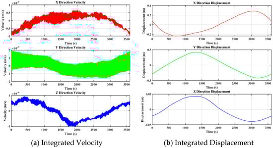 Accelerometer Integration Results: (a) Velocity Time History Obtained from Data Integration; (b) Displacement Time History Obtained from Velocity Integration.