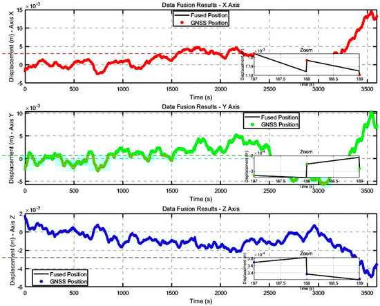 The proposed method overcomes the limitations of individual sensors and provides more accurate displacement measurements. The zoomed-in window in Figure 12 clearly illustrates the high precision of the fused data, which is critical for real-time structural health monitoring. Compared to the original GNSS and accelerometer measurements( As shown in Table 3), the fused displacement data demonstrate significant improvements in both accuracy and stability. Specifically, the root mean square error (RMSE) decreased from 0.00515 m to 0.00362 m after fusion, indicating a substantial enhancement in the overall fit to true displacement. Similarly, the Position Error Standard Deviation (PESD) decreased from 0.00428 m to 0.00257 m, and the Position Offset Standard Deviation (POSD) was reduced from 0.00673 m to 0.00476 m, reflecting a notable reduction in error dispersion and offset across all axes. These improvements highlight the effectiveness of the fusion method in mitigating sensor-specific noise and drift. Furthermore, the fused time series exhibits no significant drift or abrupt fluctuations, demonstrating excellent consistency and temporal stability. Overall, these metrics confirm that the proposed fusion algorithm not only enhances measurement precision but also ensures reliable performance over extended monitoring periods, making it highly suitable for long-term structural health monitoring applications.