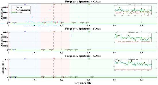 Based on the building’s frequency response characteristics and signal sources, the spectrum in the experiment (as shown in Figure 13) is divided into three typical regions: (1) U1 (Static/Quasi-static Response Zone): Frequency range of 0–0.12 Hz. This region mainly reflects the building’s slow deformation response to gradually varying loads such as wind and ambient temperature. GNSS contributes significantly in this zone, exhibiting strong low-frequency displacement detection capabilities. (2) U2 (Mid-to-Low-Frequency Disturbance Zone): Frequency range of 0.12–0.23 Hz. This region is primarily influenced by wind loads, thermal expansion and contraction, and GNSS multipath effects. A distinct spectral peak is often observed around 0.17 Hz. In this zone, both GNSS and fused GNSS–accelerometer data effectively identify subtle structural disturbances. (3) U3 (Primary Structural Mode Response Zone): Frequency range of 0.149–0.298 Hz. This corresponds to the expected range of the building’s fundamental vibration modes, capturing its main structural responses under external excitations such as earthquakes or strong winds. In this zone, the fused spectrum shows a noticeable energy concentration, marking it as a critical frequency band for structural health monitoring.