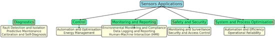 Figure 1 illustrates the diverse domains where sensors play a pivotal role, including diagnostics, control, monitoring, safety, and system optimisation. Diagnostic applications benefit from robust fault detection and predictive maintenance schedules; control systems require real-time adjustments to optimise performance; monitoring tasks ensure environmental compliance and accurate data logging; and safety systems are essential for protecting assets and personnel.