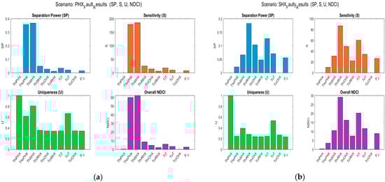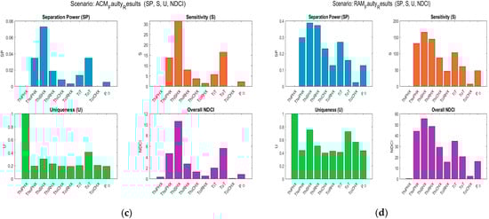 Figure 3 presents the computed SP, S, and U values for the four ECS fault modes (PHX, SHX, ACM, and RAM), alongside the resulting NDCI for each sensor. The bar charts highlight which sensors excel in fault separation and sensitivity, as well as how unique each sensor’s response is relative to others. This information is crucial for identifying sensor candidates with high diagnostic relevance.