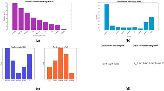 NDCI and mRMR score comparison across fault modes. (a) Overall sensor ranking by NDCI; (b) global mRMR ranking; (c) top sensors comparison by NDCI vs. mRMR; (d) minimal sensor subsets comparison.