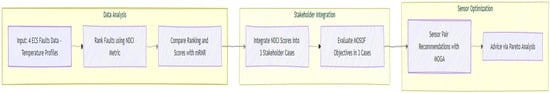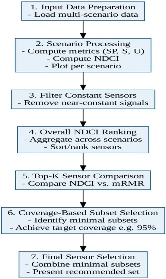 The flowchart in Figure 5 illustrates the updated procedure for computing NDCI and selecting optimal sensor sets under multiple fault scenarios in MATLAB-R2024a environment. Compared to the earlier version, this refined approach encompasses a multi-scenario perspective, integrates a global mRMR ranking, and incorporates coverage-based subset selection. The following steps summarise the methodology: