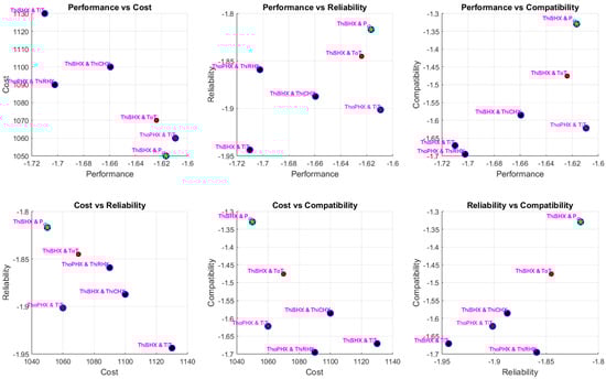 The resulting Pareto set provides a diverse array of sensor-pair configurations. For visualisation, pairwise scatter plots are generated for every combination of two objectives. Each plotted point represents a sensor pair and is annotated with the corresponding sensor names. This comprehensive analysis supports informed decision-making in complex sensor network implementations and demonstrates the benefits of integrating NDCI into the MOSOF.