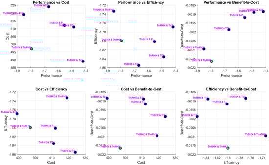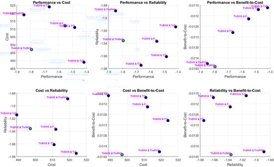 Simulation results of each scenario are presented below in Figure 7, Figure 8 and Figure 9. The MATLAB-R2024a code of the simulations is available at GitHub [30], facilitating reproducibility and further exploration of the data. Each point in these plots represents a sensor pair, annotated with sensor names. In the OEM scenario, for example, sensor pairs such as “ThiSHX (Temperature, hot, inlet Secondary Heat Exchanger)–TiT (Temperature, inlet Turbine)” and “ThiRHX (Temperature, hot, inlet Reheater)–P_O (Pack Outlet)” emerged as promising candidates. Feasible solutions (those that met all constraints) are clearly distinguishable from infeasible ones, with blue markers denoting feasible sensor pairs and red crosses indicating violations. The optimal pair (selected as the first feasible solution with the best trade-off among objectives) is highlighted with a green star. Notably, the incorporation of NDCI as a central performance metric enabled greater discrimination between sensor pairs, revealing non-obvious combinations that offer balanced performance and cost advantages.