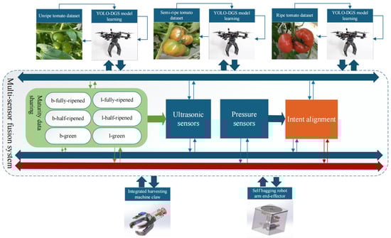 Significant advancements have been made in the application of drones within the fields of artificial intelligence and machine learning, particularly in smart agriculture. In the field of computer vision, drones can capture high-resolution images and videos, facilitating advanced functions such as image recognition, object tracking, and even 3D scanning [6,7]. As illustrated in Figure 1, an intelligent tomato harvesting system designed for smart agriculture demonstrates the power of multi-sensor fusion technology [8,9,10] and deep learning algorithms to enable fully automated operations [11]. At the core of this system lies the YOLO-DGS object detection model, which was trained on a comprehensive tomato dataset encompassing various maturity levels, including semi-ripe and fully ripe stages. This model is capable of accurately identifying six distinct maturity stages, such as b-fully-ripened and l-half-ripened fruits. In terms of fruit harvesting, existing methods primarily combine manual bagging and manual picking, which rely on human labor and are limited by high labor costs and low harvesting efficiency [12,13,14]. In the perception layer, the system integrates ultrasonic sensors for real-time distance measurement and obstacle avoidance, alongside pressure sensors to monitor harvesting force. These sensors, combined with visual recognition results, form a multi-dimensional perception network. The actuators feature an adaptive robotic end-effector [15] that intelligently adjusts grasping force and angle based on fruit maturity and real-time sensor feedback, ensuring precise and damage-free harvesting. This system establishes a complete closed-loop workflow, seamlessly integrating environmental perception, fruit recognition, maturity assessment, and automated harvesting. It exemplifies the synergistic application of machine vision, multi-sensor fusion [16], and intelligent control technologies in modern smart agriculture, offering an efficient and reliable solution for automated agricultural produce harvesting [17]. The promotion of smart agriculture has also reduced the physical labor required of farmers and lowered the overall costs, bringing favorable opportunities for the development of agriculture [18].