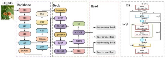 The accuracy, speed, and lightweight nature of the tomato detection model are crucial for the efficient operation of harvesting robots [35]. Addressing the multi-scale target detection characteristics in complex backgrounds, this paper proposes a lightweight target detection algorithm, YOLO-DGS, whose structure is shown in Figure 2. The model is an improvement upon YOLO v10, with a primary focus on lightweight design in the neck network. First, this paper removes the maximum target detection layer in the YOLO v10 detection head to reduce the model’s width, depth, and parameter count, thereby enhancing its target recognition capability. Second, we introduce the C2f-GB, a segmented convolution module that performs staged convolution on feature maps, significantly reducing both parameter and computational load while maintaining accuracy. Additionally, the BiFPN (bidirectional feature pyramid network) is adopted to more effectively transmit and integrate high- and low-level features. Finally, this paper incorporates the SE attention mechanism (Squeeze-and-Excitation Networks) to explicitly model the interdependencies between convolutional feature channels, thus enhancing the network’s representational power.