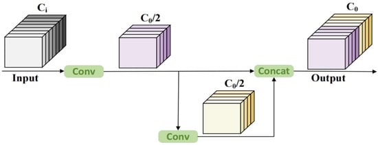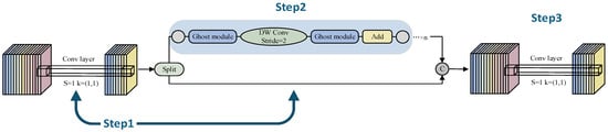 The GhostBottleneck module plays a critical role in C2f-GB by generating redundant features through inexpensive operations, significantly reducing parameters and computational complexity compared to traditional convolutions. This makes it more suitable for mobile and edge devices. Similar to the basic residual block in ResNet, the GhostBottleneck module combines multiple convolutional layers with shortcuts. The C2f-GB network consists of two stacked Ghost modules: the first serves as an expansion layer to increase the channel count, with an expansion ratio that reflects the output-to-input channel ratio; the second Ghost module reduces the channel count to match the shortcut path. These modules are connected via a downsampling layer and depthwise convolution with a stride of 2. Inspired by MobileNetV2, the second Ghost module in C2f-GB does not apply ReLU after depthwise convolutions to avoid information loss. Batch normalization (BN) and ReLU activation are applied after each layer. The operation of the stacked Ghost modules is implemented through stepwise convolutions, as shown in Figure 4. The theoretical acceleration ratio of Ghost modules compared to regular convolutions is as follows: (Among them, c represents the input channels, n represents the output channels, h′ and w′ are the height and width of the feature map, respectively. The size of the conventional convolutional kernel is k, the size of the convolutional kernel for the linear transformation is d, and the transformation is carried out s times).