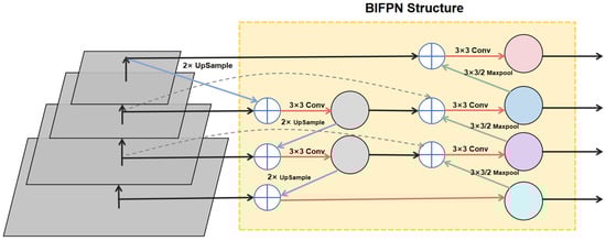 The Bi-Directional Feature Pyramid Network (BiFPN), based on the FPN network, enhances the feature pyramid’s expressive power by adding contextual information and assigning appropriate weights to fuse feature information. BiFPN introduces bidirectional connections between adjacent levels of the feature pyramid during feature fusion, enabling bidirectional information flow. The enhanced network performs feature integration from high-level to low-level features (top-down) and low-level to high-level features (bottom-up). This bidirectional feature integration helps more effectively capture information across different scales, improving the tomato ripeness detection network’s ability to handle objects of various sizes and complexities. BiFPN also uses a weighted feature fusion mechanism, optimizing multi-scale feature integration through adaptive learning of fusion weights, allowing the network to more effectively leverage features from different layers, as shown in Figure 5.