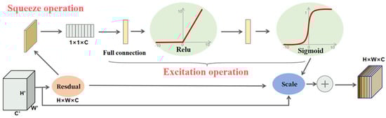 The Squeeze-and-Excitation (SE) mechanism introduces a channel attention mechanism, as depicted in Figure 6, enabling the neural network to focus on the most crucial features for the current task. The core operations of the SE module consist of the squeeze operation and the excitation operation. Firstly, given an input feature map X∈RH×W×C, the squeeze operation aggregates the feature map across the spatial dimensions (H × W) through global average pooling (GAP) to generate a channel descriptor. As shown in Equation (2), where zc is the compressed scalar value of the c-th channel, H and W are the height and width of the input feature map, respectively, and xc(i,j) is the feature value at the spatial position (i, j) of the c-th channel of the input feature map. That is, for an input feature map with dimensions H×W×C, the global average pooling operation calculates the average value of each channel across all spatial positions, compressing each channel into a single scalar. The generated average values form a vector of length C, which serves as the channel descriptor of the feature map. Next, the excitation operation applies a non-linear transformation to the channel descriptor z to generate channel weights, as shown in Equation (3). Here, s is the final generated vector of channel weights, W1 is the weight matrix of the first fully connected layer, which is used for dimensionality reduction, W2 is the weight matrix of the second fully connected layer, which is used to restore the dimension, δ represents the ReLU activation function, introducing non-linearity, and σ is the Sigmoid activation function, which restricts the weights within the range of [0, 1]. This operation applies a weighting function to the channel descriptor obtained from the squeeze operation to emphasize the important channels. Specifically, the C-dimensional vector obtained from the squeeze operation passes through a fully connected (FC) layer, which introduces a non-linear transformation via an activation function (such as ReLU). The weights learned by the FC layer are restricted to the range between 0 and 1 by the Sigmoid activation function. These learned weights reflect the activation level of each channel. Finally, the original C-dimensional vector is multiplied by these weights to generate a weighted vector, as shown in Equation (4). Here, the result is the weighted output feature map, which dynamically adjusts the attention of each channel, enhancing the network’s ability to efficiently utilize information.
