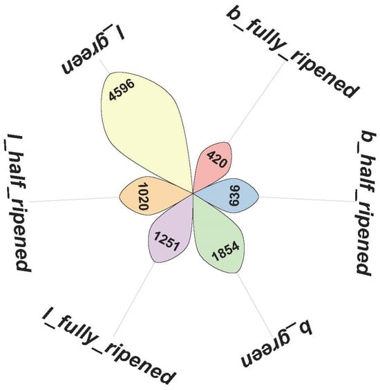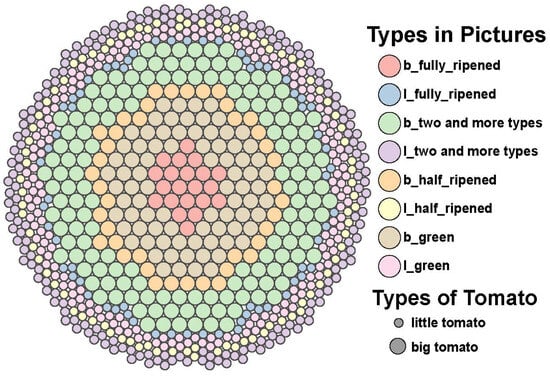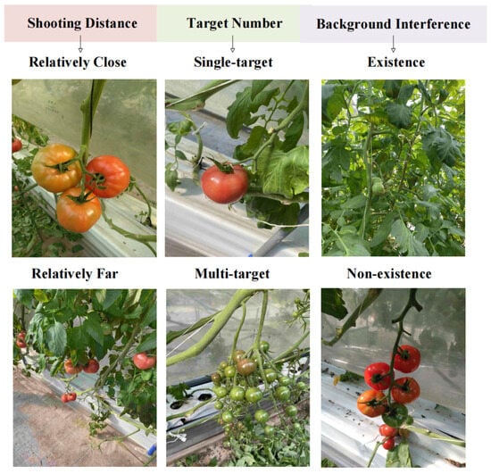 This experiment focuses on two types of tomatoes: common tomatoes and cherry tomatoes, with each type having three maturity stages: ripe, semi-ripe, and unripe. The dataset used in this study is sourced from a publicly available tomato fruit dataset from local farms in Chennai, Tamil Nadu, India. This dataset comprises 804 images of common tomatoes and cherry tomatoes, with a total of 9777 annotated targets. Figure 7 illustrates the distribution of each target category, while Figure 8 shows the types of targets present in each image. In Figure 8, the larger circles represent common tomatoes, and the smaller circles represent cherry tomatoes. The dataset was captured using an independent camera, and the images have a resolution of 3024 × 4032. In terms of the shooting distance, the dataset includes two types: relatively close and relatively far. Correspondingly, the sizes of the target objects are also classified into larger and smaller according to the distance. Regarding the number of targets, the dataset covers two situations: single-target and multi-target. As for the background interference, the dataset is divided into two cases: with background interference and without background interference, as shown in Figure 9. The dataset was randomly divided into a training set, a validation set, and a test set, with a ratio of 7:2:1. The weight decay was set to 0.0005, and the initial learning rate was set to 0.01.