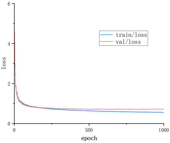 To ensure the effectiveness of the experiments, all the experiments presented in this work were conducted in a consistent operating environment. The specific configurations are detailed in Table 2. In order to obtain the best training results, all the models in this experiment were trained for 1000 epochs. The loss curves of the training set and the validation set are shown in Figure 10. As can be seen from the figure, the trends of the train/loss and the val/loss are consistent. Both of them decrease as the number of epochs increases. The loss of the validation set is always slightly higher than that of the training set, but there is no divergence phenomenon. Moreover, the gap between the two is within a reasonable range, which is the normal generalization error of the model on the validation set. Therefore, the model does not exhibit the situation of overfitting.