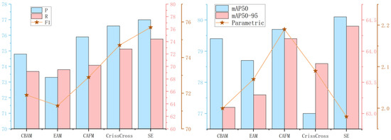 To validate the effectiveness of the proposed channel attention mechanism, this paper integrated it with CBAM, EMA, CAFM, and CrissCross Attention at the same positions in the neck network. The resulting Precision (P), Recall (R), F1 score, parameter count, and mAP curves are shown in Figure 11. The results indicate that the model’s performance is optimal when using the SE channel attention mechanism.