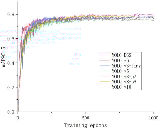 Table 1 indicates that, compared to models with one, three, and four detection heads, the improved two-detection-head model (YOLO-DGS) achieved 3.5%, 0.3%, and 3.1% improvements in recall rate, respectively. The detection speed increased by 59.6 fps, 71.9 fps, and 153.5 fps, respectively. Compared to models with three and four detection heads, the parameter count decreased by 26.7% and 32.2%, respectively. Furthermore, the mAP50 increased by 3.1% and 1.4% when compared to models with one and four detection heads. Although the mAP50 for the three-detection-head model is slightly higher, the other performance metrics of the improved model surpass those of the three-detection-head configuration. This clearly demonstrates that removing the maximum target detection layer improves target recognition in this dataset and yields better overall performance.