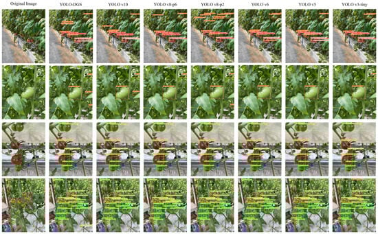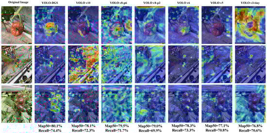 This paper used XGrad-CAM [38] for a visual analysis of the model’s performance to evaluate the YOLO-DGS model’s visual focus and attention. The pre- and post-improvement visual attention results for tomato detection are shown in Figure 13. The heatmaps reveal that, for both single-object and multi-object detection tasks, as well as for occluded objects, YOLOv10 shows poor attention to small objects, which reflects the positive effect of removing redundant detection heads. Both YOLOv8 models exhibit attention dispersion and fail to focus on the correct targets. YOLOv6 and YOLOv5 also show insufficient attention to target objects, especially in complex multi-object occlusion scenarios. This highlights the advantage of the dynamic adjustment of channel attention in the improved model, which increases information utilization efficiency. Finally, YOLOv3-tiny suffers from attention dispersion in both single-object and multi-object occlusion cases, and shows a lack of focus on small targets. In contrast, the improved YOLO-DGS model accurately identifies targets in all scenarios, including single-object, small-object, and multi-object occlusion cases. These results demonstrate that YOLO-DGS significantly enhances feature extraction capabilities and is less affected by complex environments.