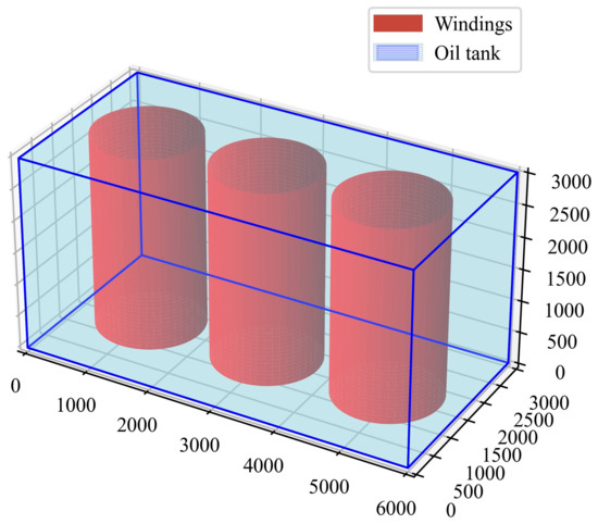 In the transformer environment modeling, the O-XYZ coordinate system is constructed, with the dimensions of length, width, and height being (6000, 3000, 3000) mm. The three windings of A, B, and C phases are cylindrical, with radii of 800 mm and heights of 3000 mm, centered at (1100, 1500), (3000, 1500), and (4900, 1500), respectively. The internal 3D map of the transformer is shown in Figure 2.