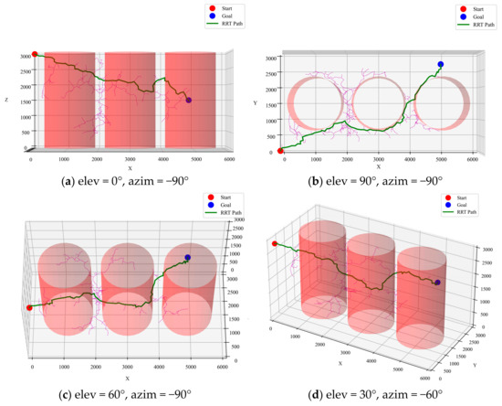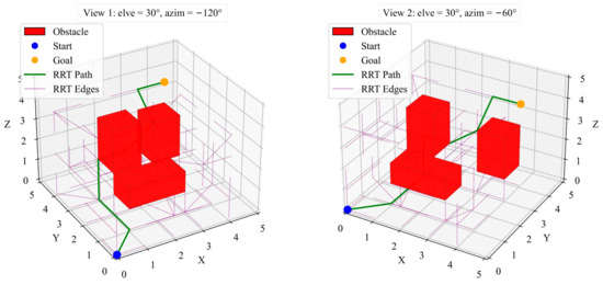 - Validity Check: Before adding the new node to the tree, check whether the path from to collides with any obstacles, i.e., whether it satisfies the collision test function in Equation (1). If there is no collision, add to the tree and record as its parent.