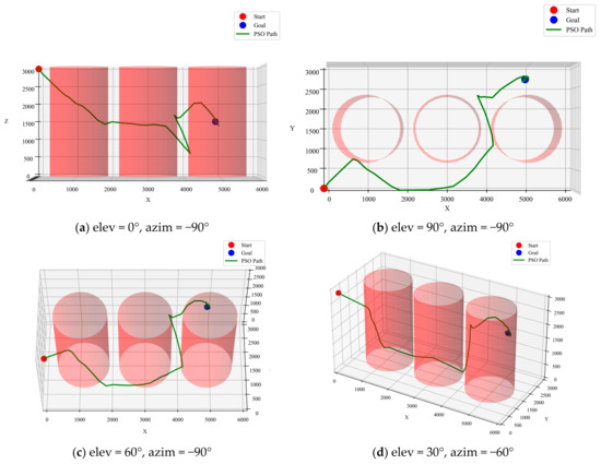 The PSO algorithm simulates swarm behavior for global search and can quickly approach the optimal path solution through the iterative updating of particles, demonstrating excellent performance in path optimization within complex environments. The pseudocode of the PSO algorithm is shown in Algorithm 3.