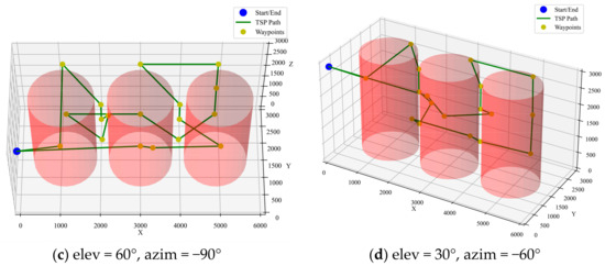 The path-planning methods mentioned above primarily focus on optimizing the path between two points. However, the internal inspection micro-robot in the transformer needs to start from the starting point, route through a number of inspection points to capture images in sequence, and finally return to the starting point to complete the task. Therefore, these methods are not suitable for solving this type of problem. This issue is similar to the three-dimensional Traveling Salesman Problem (TSP) [25], which requires starting from a point, visiting multiple nodes and going back to the starting point while minimizing the total path length. Classical TSP solution methods mainly include the Held–Karp algorithm, greedy algorithm, genetic algorithm (GA), simulated annealing algorithm, and ACO [26,27]. Among these, ACO is widely used to solve TSP due to its high adaptability and robustness [28,29]. For example, Yan et al. [30] defined the multipoint planning problem with indoor path constraints as the Indoor Traveling Salesman Problem (ITSP) and solved it by combining Dijkstra’s algorithm and branch and bound (B&B) algorithm. Janoš et al. [31] solved the 2D indoor TSP problem using the SFF* algorithm. However, unlike the classical TSP, the transformer’s inspection points are subject to obstacles, making the inspection micro-robot’s path planning more complex than a classical TSP. When performing path planning for an inspection micro-robot in a transformer, the challenge is not only to optimize the total path length through multiple inspection points, but also to handle a complex three-dimensional environment with obstacles. This makes the problem more akin to a Constrained Traveling Salesman Problem (CTSP) and necessitates the adaptation of classical TSP solving methods to accommodate these environmental constraints. Classical TSP algorithms, such as the Held–Karp algorithm and the greedy algorithm, are usually very effective in solving the shortest path in the obstacle-free environments. However, in the presence of complex obstacles, these methods cannot directly address the issue of path feasibility. Genetic algorithms and simulated annealing algorithms, while possessing some global search capability, are prone to falling into local optimal solutions in high dimensional environments with numerous obstacles and may lack a consideration of path coherence. ACO, with its adaptivity and robustness, has become an effective tool for solving complex TSP problems [32].