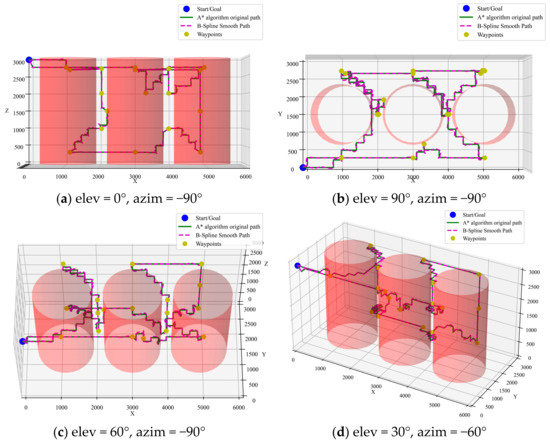 - Integration of path-planning algorithms: Building upon the pre-planning stage, path-planning algorithms such as A*, RRT, and PSO are utilized to generate detailed paths. The A* algorithm, when integrated with the pre-planned node sequence, demonstrates the best performance in terms of path length, smoothness, and stability. The B-spline smoothing method is further applied to enhance the fluidity and naturalness of the robot’s movement path, addressing the limitations of traditional A* algorithms that tend to produce right-angle paths.
