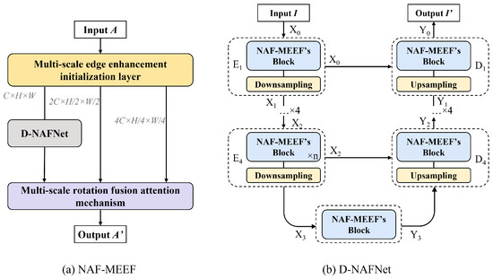 Dual-brand Nonlinear Activation-Free Network (D-NAFNet) is constructed as the core feature extractor of the algorithm. It adopts an efficient, lightweight UNet architecture and employs the Nonlinear Activation-Free Network Block (NAF-MEEF’s block) as its backbone, enabling hierarchical coordination during feature extraction.