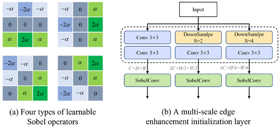 This design is particularly motivated by the need for strong initialization in low-level vision tasks such as denoising, where edge preservation plays a vital role in visual quality. By introducing edge enhancement early in the network, the model is better guided during training to retain contours and fine textures, which are often degraded in standard convolutional pipelines. The structure of the trainable Sobel operator and the multi-scale fusion process is illustrated in