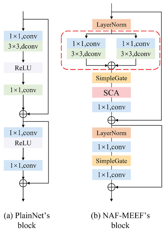 Figure 1a) aims to learn the mapping relationship between noisy images and clean images in order to effectively remove noise while preserving image details as much as possible. To achieve this goal, NAF-MEEF has enhanced its feature extraction and edge information preservation capabilities through multiple architectural innovations. Firstly, we designed a 2D dual-branch deep convolutional block (2DDCB) in the NAF-MEEF’s block and constructed a D-NAFNet feature extraction network using this block. Unlike directly using NAFNet as the backbone, we redesign the feature extraction pathway, incorporating D-NAFNet (