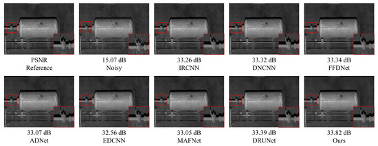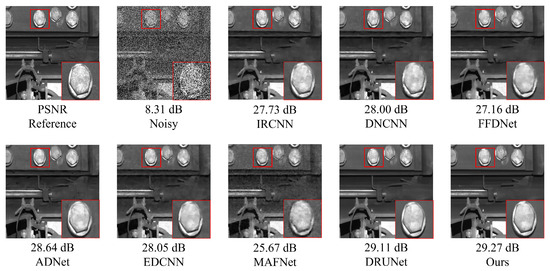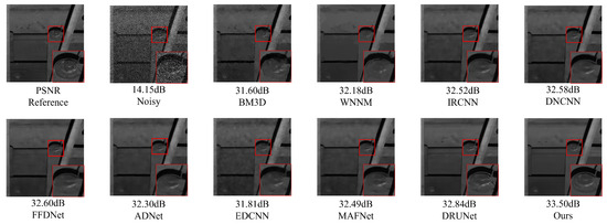 Figure 7 shows that other methods suffer from insufficient denoising or texture loss. The proposed method not only ensures denoising performance but also preserves more detailed information, achieving better reconstruction of edge details such as the ‘bolt and cotter pin’ in the image. Traditional methods such as BM3D and WNNM, although achieving certain denoising performance, exhibit texture blurring at the ‘cotter pin’ area, resulting in unclear visual imaging. Compared with traditional methods, ADNet and MAFNet can restore more image details. Partial texture details can be seen in the local detail map, but the reconstructed detail information is relatively messy and cannot effectively represent the image texture. The denoising performance of IRCNN, DNCNN, and FFDNet has been improved to some extent, but there is still blurring in some areas with rich structural information; DRUNet, as a suboptimal result, has a good denoising effect, but there is still some texture differences after zooming in on details. Compared with other methods, NAF-MEEF achieves fine filtering while preserving more edge detail information, resulting in optimal denoising and image restoration performance.