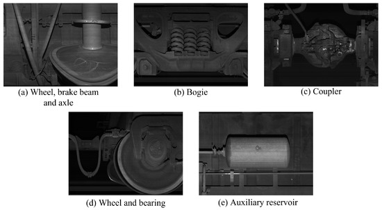 To effectively evaluate the algorithm’s denoising performance on various components of railway freight cars, we divided the collected large-sized images (1400 × 1024) into five categories based on actual operational scenarios (as shown in