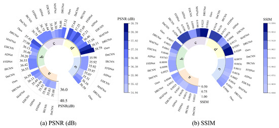 The denoising effect is mainly compared from two aspects: visual subjective perception and quantitative indicators. Visual subjective perception can perceive the degree of subjective information retained in denoised images, and the denoising effect can be measured by qualitative analysis of the denoised images. Quantitative indicators measure the degree of deviation between the denoised image and the target image, with smaller deviations indicating superior denoising performance. Peak Signal-to-Noise Ratio (PSNR) and Structural Similarity Index (SSIM) are widely employed metrics for quantitative analysis and evaluation in image-denoising tasks.