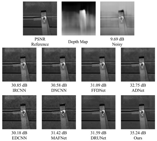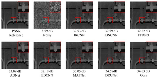 Table 8, although the runtime of our method is slightly higher than that of lightweight models such as IRCNN (0.0029 s) or DnCNN (0.0067 s), it still meets the real-time requirements of practical industrial applications. In particular, the model variant using 18 basic blocks achieves a good balance between denoising performance and computational cost, with an average inference time of 0.0530 s. Considering its superior denoising capability and structural detail preservation, this model demonstrates strong practical applicability in real-world inspection systems, fulfilling the dual demands of image quality and processing efficiency.